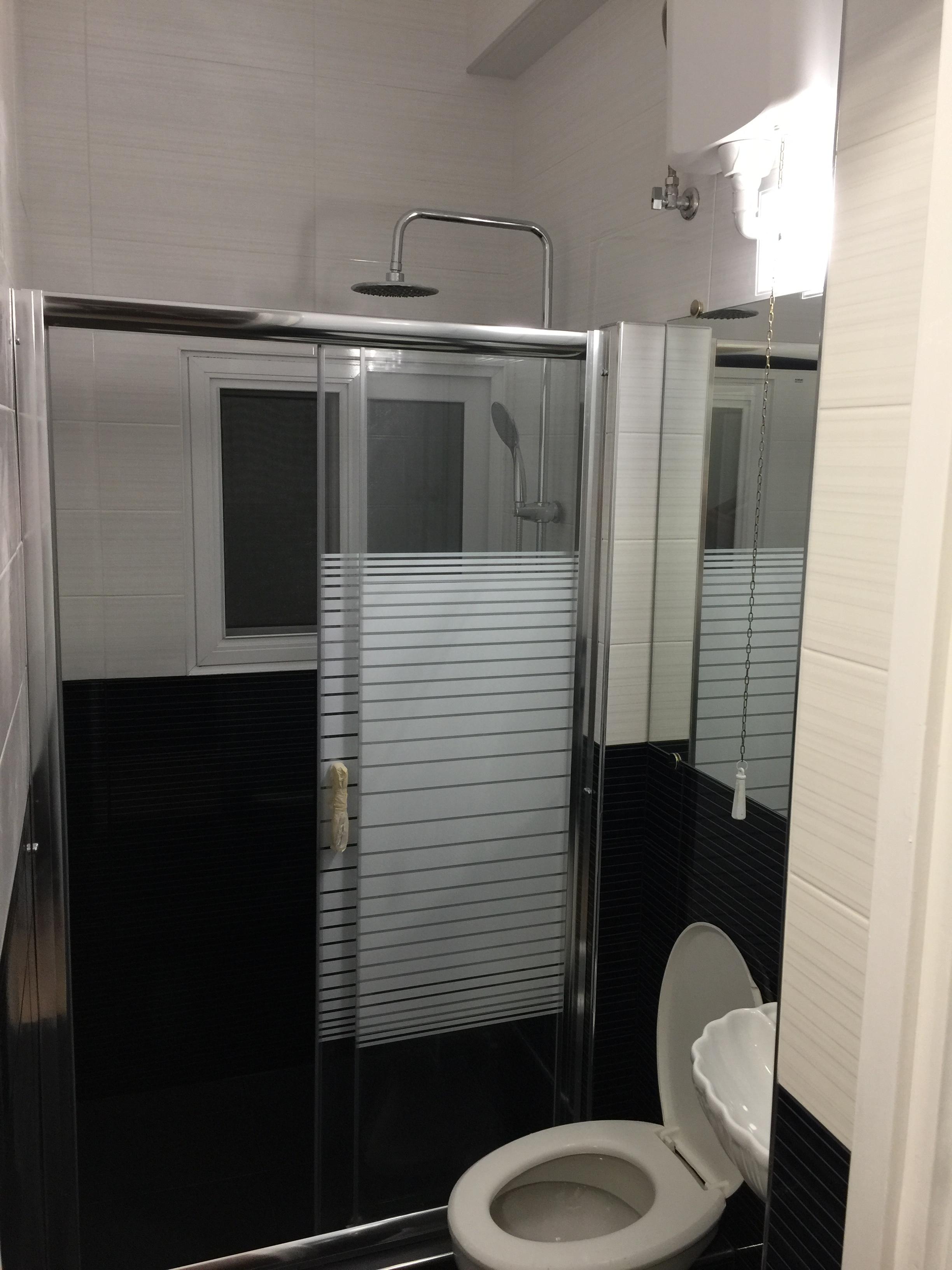 в ванной комнате стены облицованы новой, очень красивой чёрно-белой керамической плиткой, смонтирована новая душевая кабина с раздвижной стеклянной дверью, над зеркалом установлен новый светодиодный светильник;